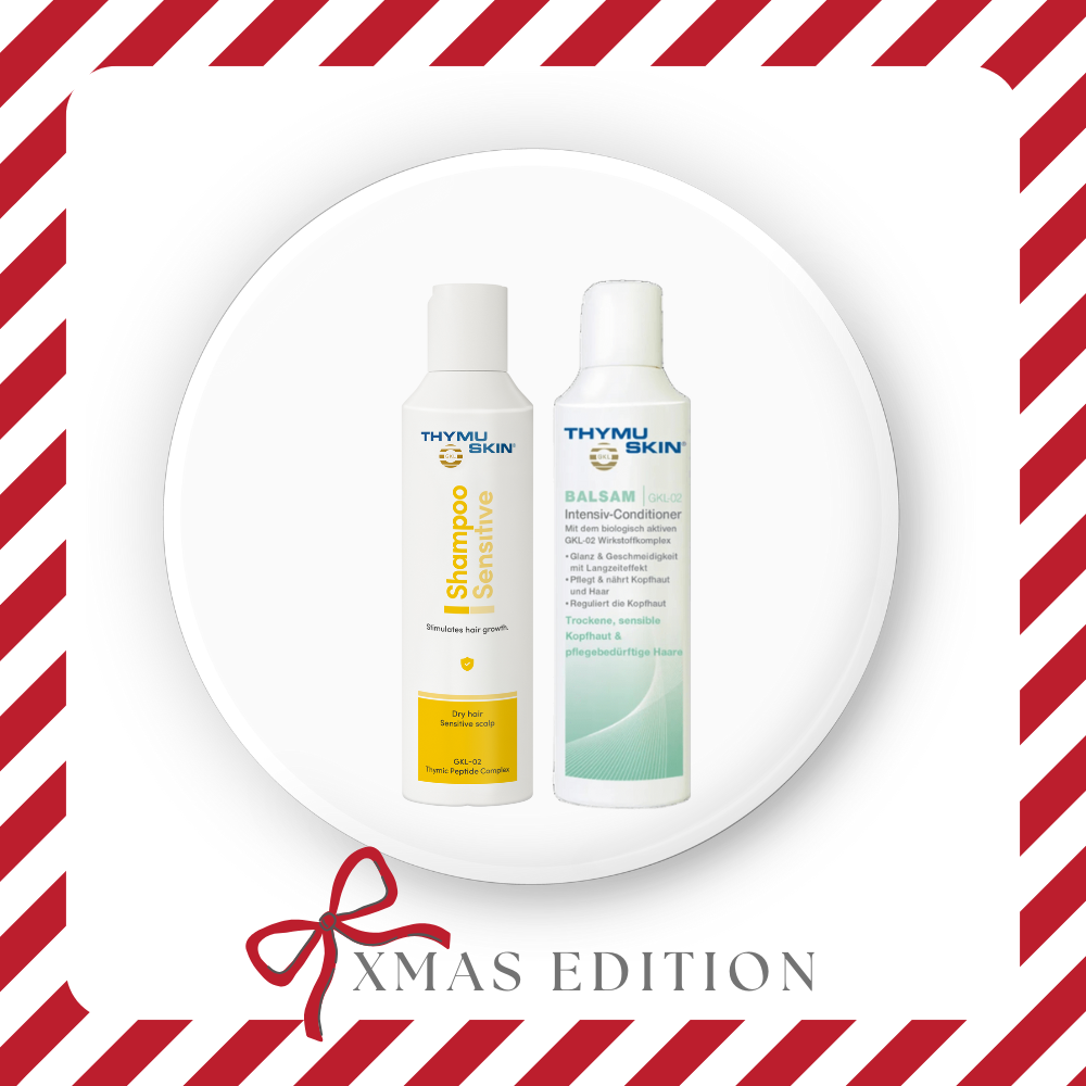 Το Thymuskin Xmas Sensitive είναι ένα σετ φροντίδας για το τριχωτό και τα μαλλιά, ειδικά σχεδιασμένο για ευαίσθητα, ξηρά και αδύναμα μαλλιά με εμφανή σημάδια έντονης τριχόπτωσης. Περιλαμβάνει δύο προϊόντα που δρουν συνδυαστικά για μέγιστη αποτελεσματικότητα. Είναι κατάλληλο για χρήση από άνδρες, γυναίκες, θηλάζουσες και παιδιά άνω των 3 ετών.